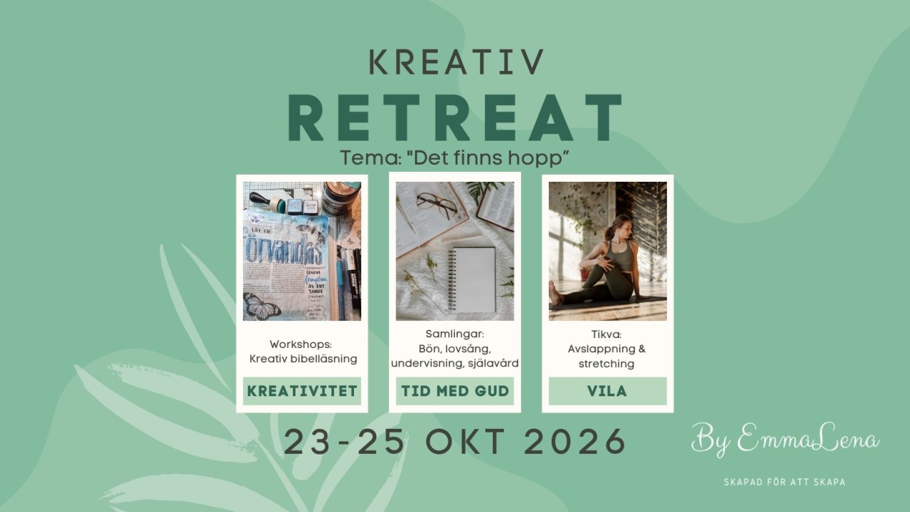 Kreativ Bibelläsning: Under denna härliga retreat får du möjligheten att prova på Kreativ bibelläsning, och det krävs inga förkunskaper! Kreativ bibelläsning innebär att skapa med olika kreativa tekniker direkt i Bibeln, men du behöver inte vara någon konstnär. Vi lär ut tekniker som alla kan göra. Oavsett om du är nybörjare eller erfaren, kommer du att få tips och inspirationer på kreativa och meningsfulla sätt att närma dig Bibelns budskap. Det handlar om att låta kreativiteten flöda och låta Bibelns ord bli levande på ett personligt sätt.